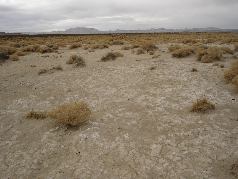 This picture illustrates a feature found all around the dry lake bed; a sort of bubbly crust made of earth and salt that collapses under any weight.