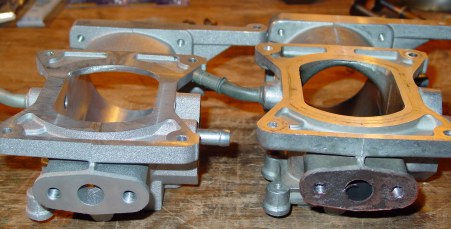 Ben Alameda Racing does a nice port job on the stock upper intake manifold. The net result is an increase of 52cfm through the intake. The B.A.R. piece is on the left.