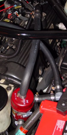 Oil is unintentionally introduced into the intake track via the PCV system. The PCV system vents crank case blow-by which contains oil vapor. This vapor is burned during the combustion process, but it also tends to pool up over time in the intake manifold. The oil vapor also reduces the effective octane rating of gasoline, making a car more likely to detonate. For these reasons (and to have a cleaner running car, have to keep the California smog-nazis happy...) I rigged up a way to remove the oil from my intake charge. I purchased a Temprite model 340 oil/air separator. This separator is used in industrial applications and has a 99.999% oil removal rate, removing particles down to 0.01 micron in size. I routed the driver's side valve cover through a separator and then ran the oil return line down to tie into the oil return from my supercharger. I haven't made the oil return connections yet because I'm curious to see how much oil my car was ingesting before.