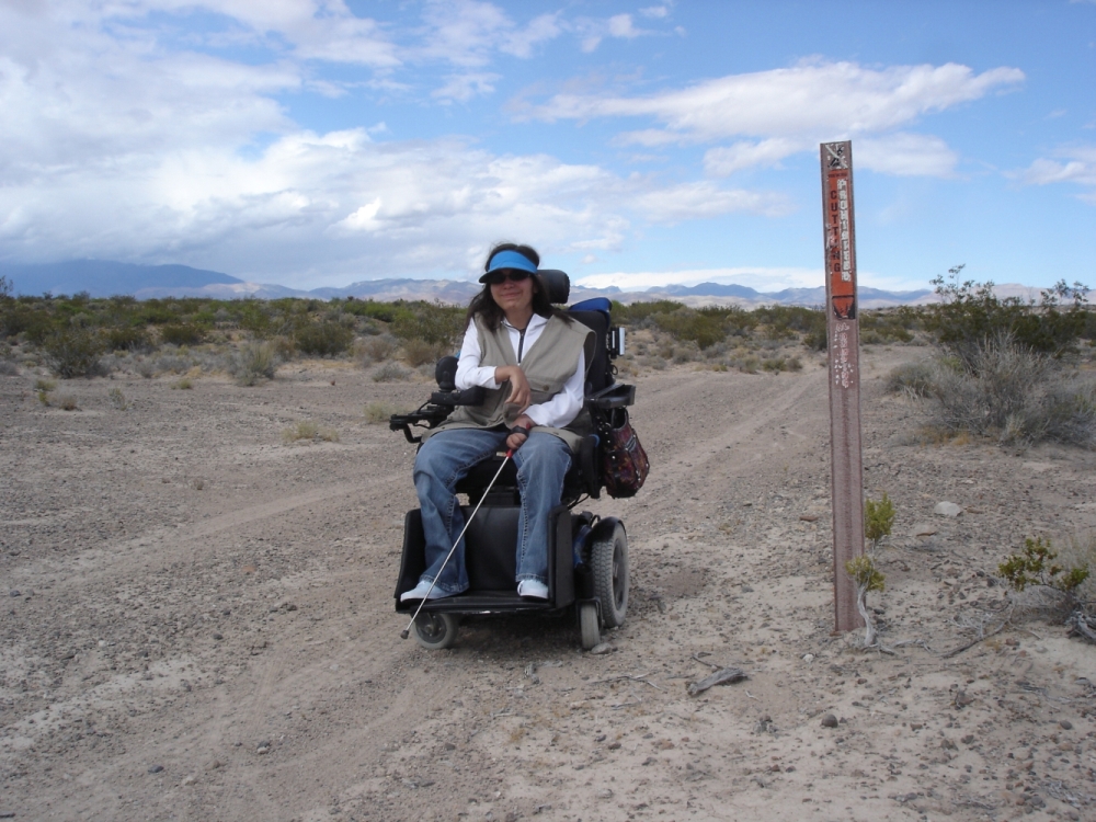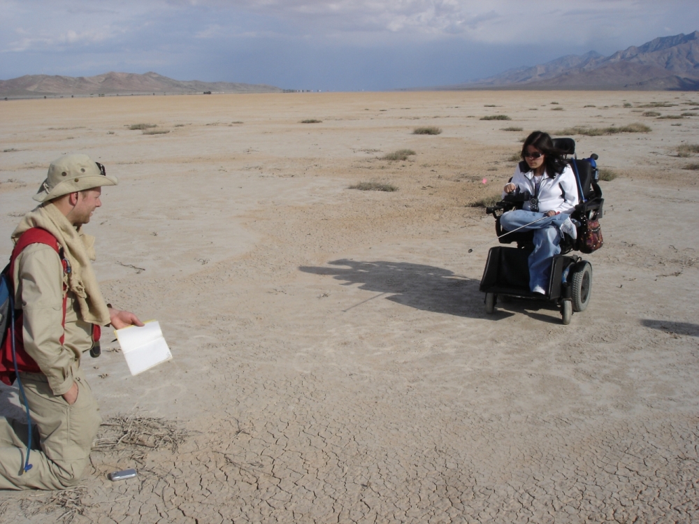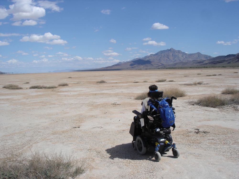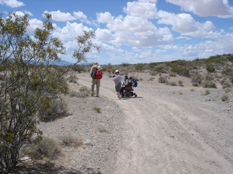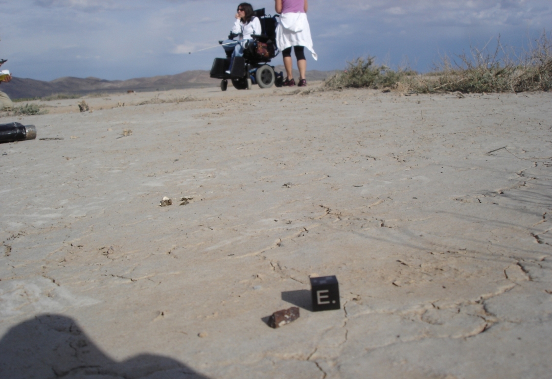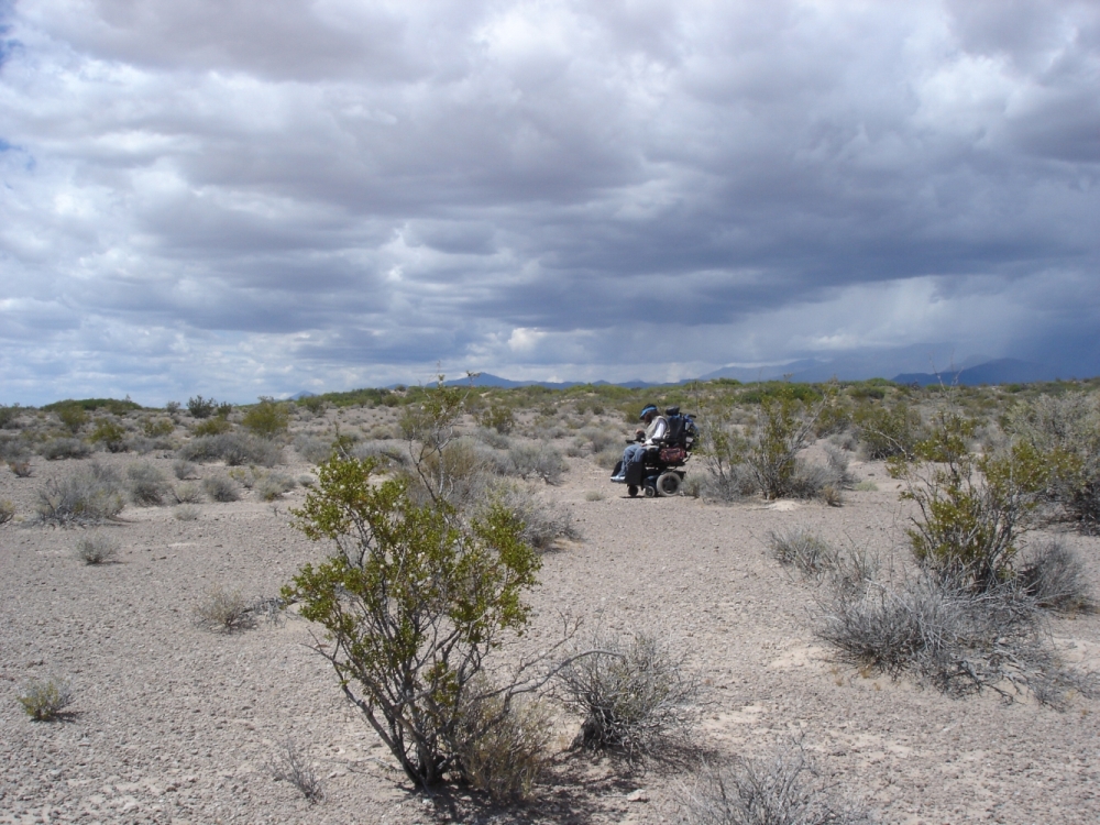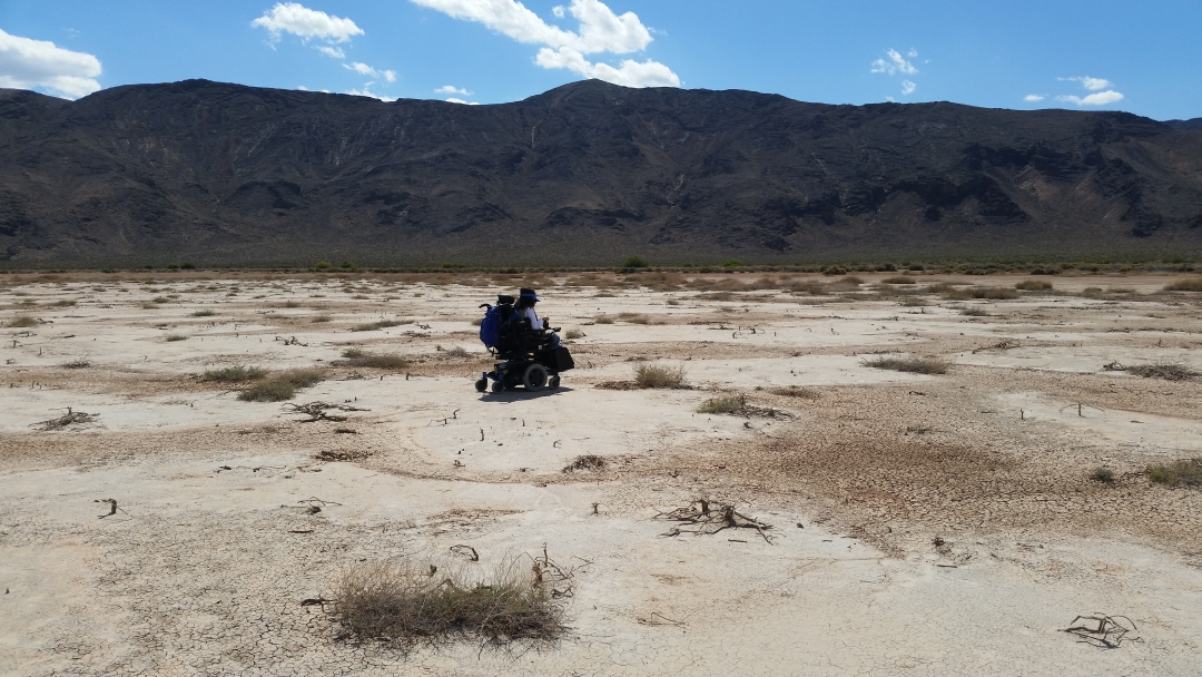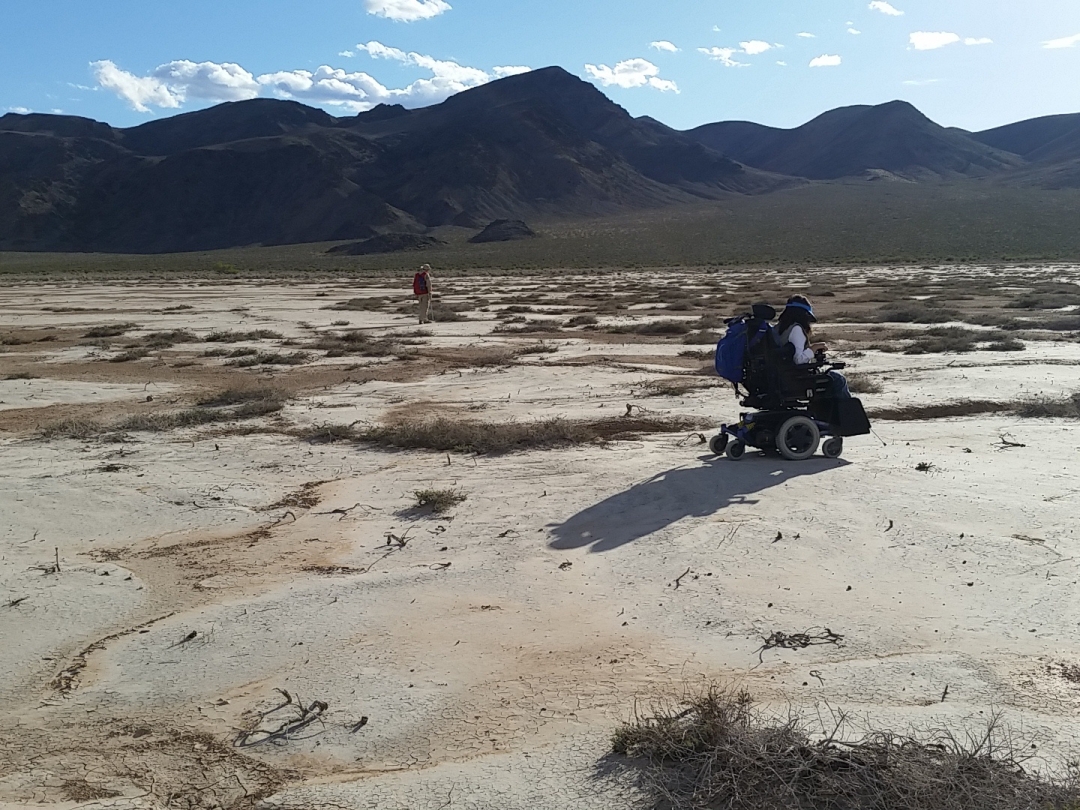 Marissa searched for meteorites while clouds and their shadows crept across Pahrump Peak in the distance. Her chair was not technically meant to be used off-road, but its large drive wheels and wide tread worked perfectly, with a few exceptions when the occasional soft spot was encountered.