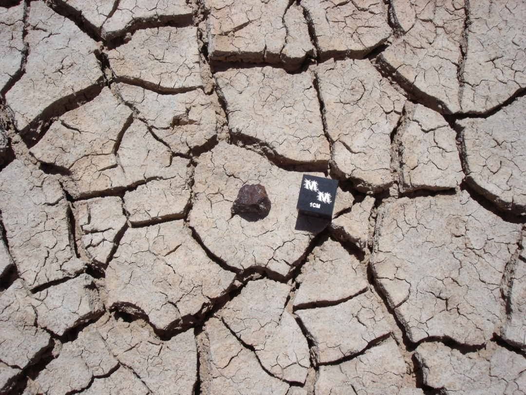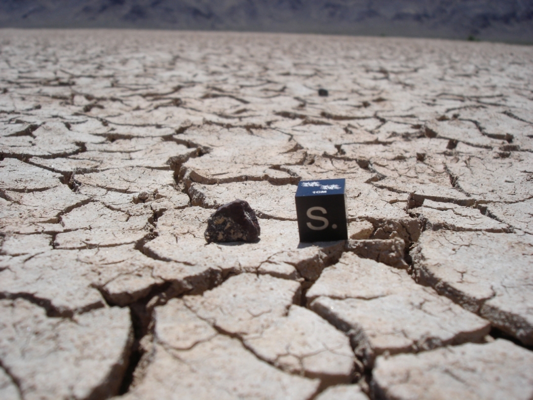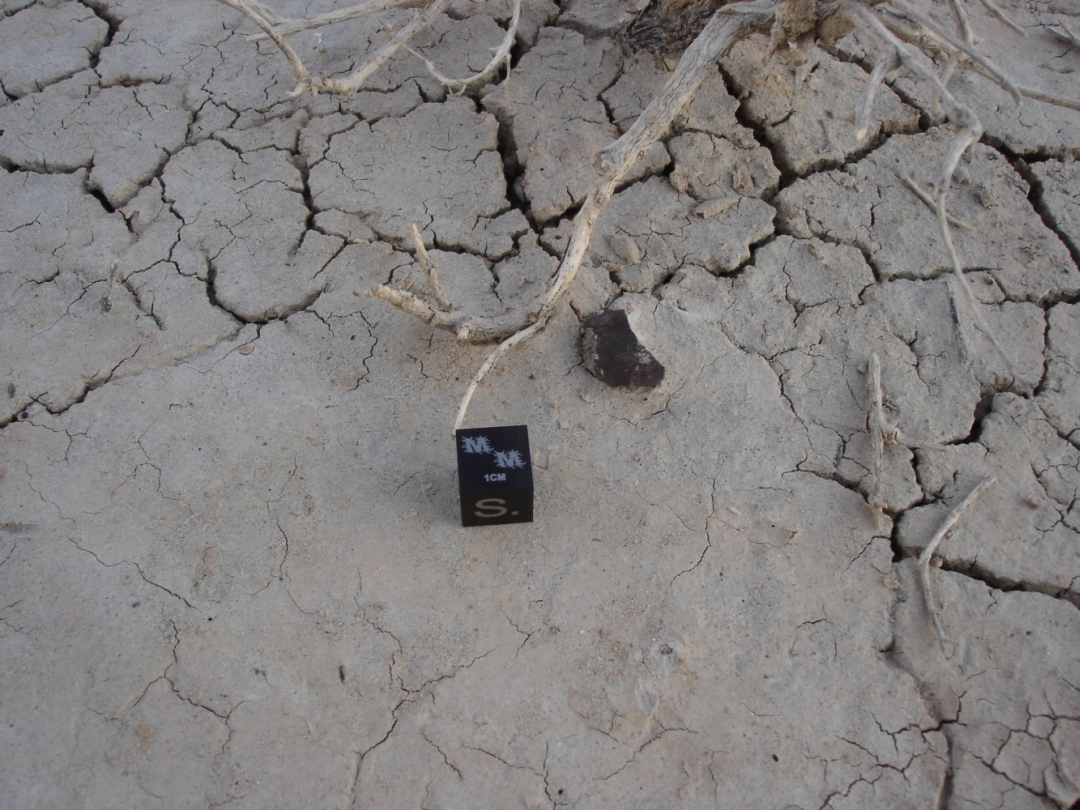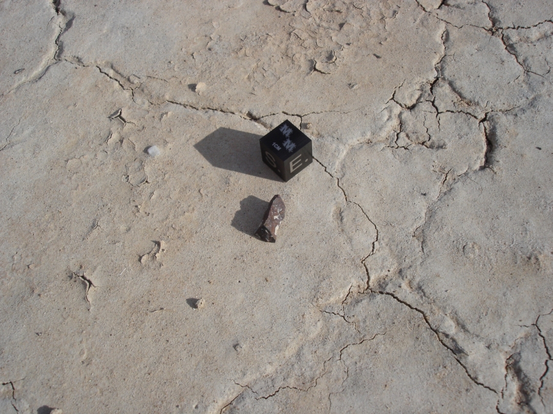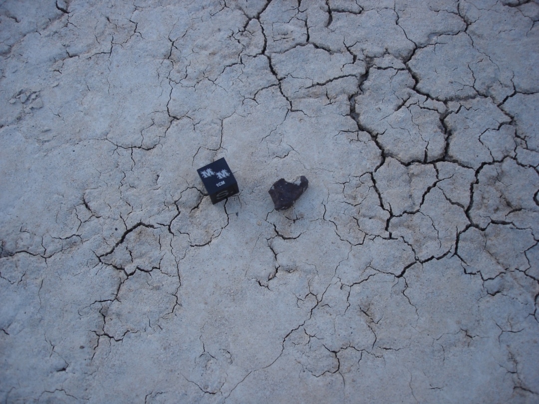 While us 3 hunters were checking our gear and Marissa was getting used to her chair on the dry lake I gave a spare magnet stick to Debbie and she set out searching. I think only 5-10 minutes passed before we heard her call out, "I think I found one." I ran over to her about 50 yards from where we parked, and there on the end of her magnet stick was a Stewart Valley meteorite fragment.