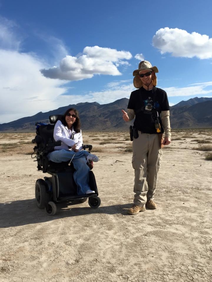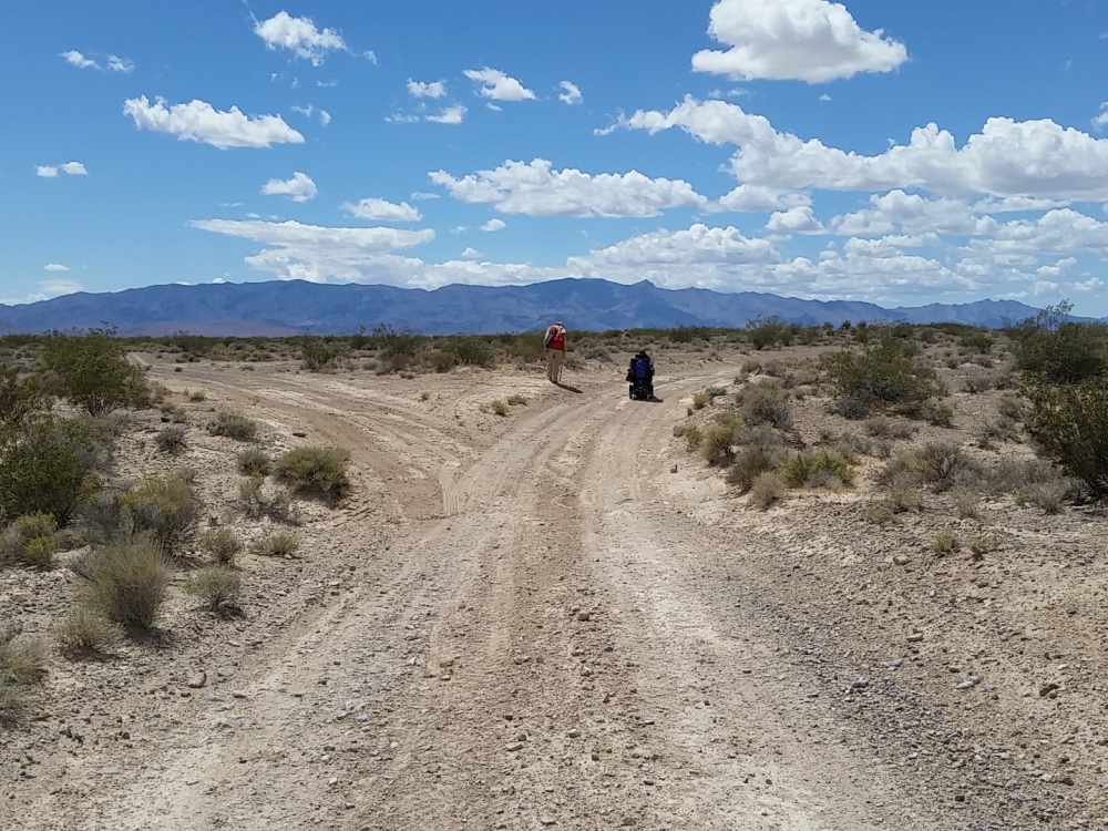 We finished up with meteorite show-and-tell and then quickly loaded up our gear and headed out to the field, Stewart Valley here we come! It was time for the first ever wheelchair meteorite hunt, and we could hardly wait. By the time we arrived at the parking spot I had selected on the Nevada side of the state line it was almost 5pm, but luckily the Summer Solstice was only a month away so it would stay light until after 8pm. We would be picking up where I left off searching the last time I was here a year ago with my friend Mark. We had ended that day with several finds, so I was hoping there were more past where we had stopped searching.